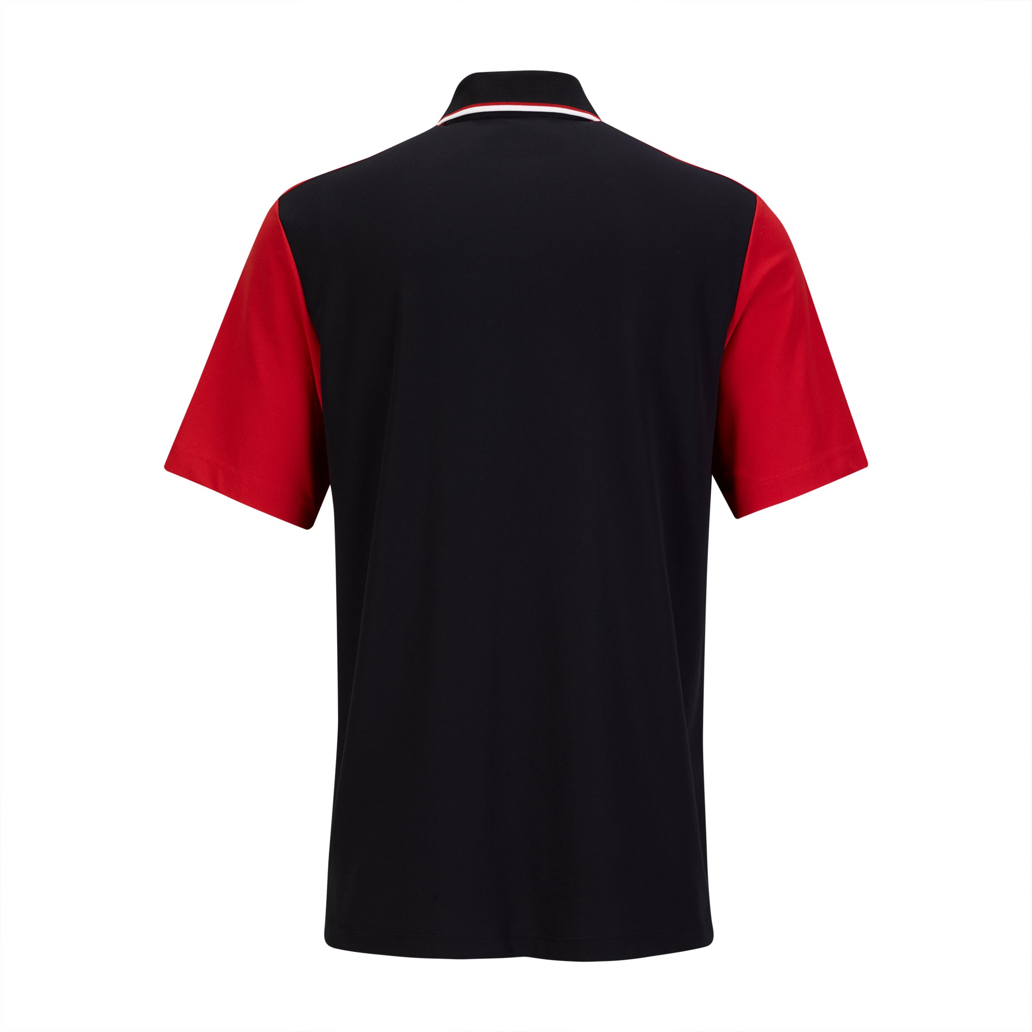 Three button polo with contrast shoulders and sleeves. Contrast stripe on collar. Contrast color on placket. LOHLA SPORT Race Star Logo on left sleeve. European slim fit. 100% Polymide.