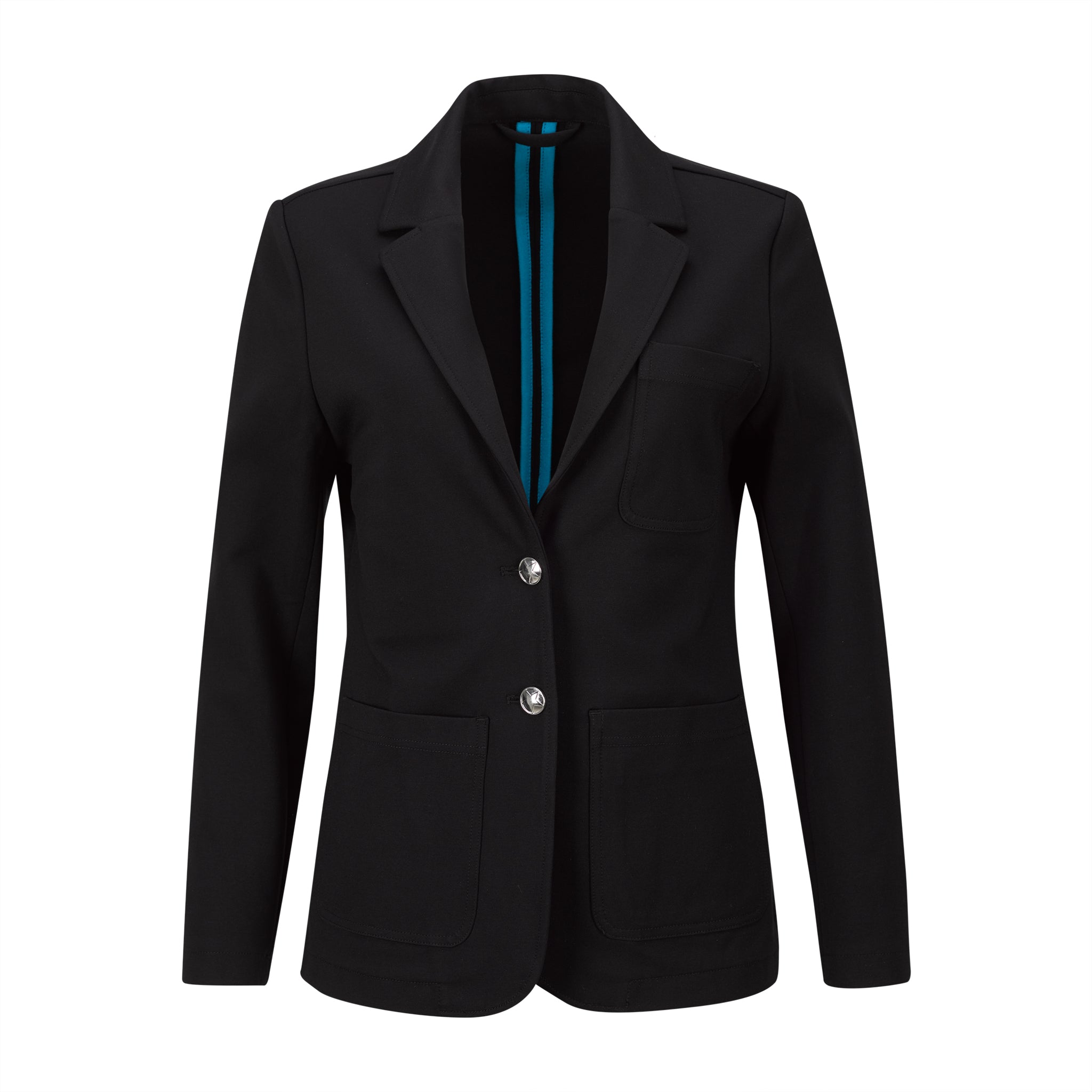A LOHLA SPORT Premiere Piece, because sometimes you want a more elevated look coming into the clubhouse. The black blazer you will wear in the clubhouse, at your favorite restaurant or traveling to your best destination. Black knit blazer with two (star imprinted silver) button closure in front. Kick pleat in back. Two lapels which can be worn down or up. Same fabric as The Very KNIT Pant so in black, could be worn as a suit. Comfortable and stretchy. You'll take it everywhere.