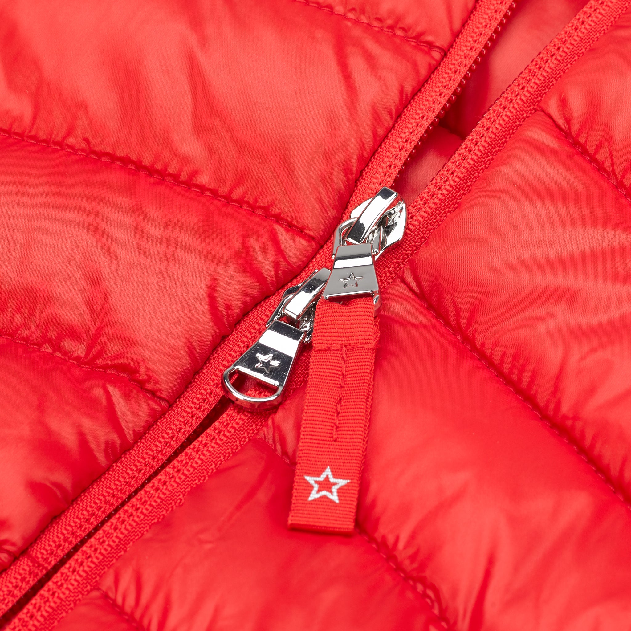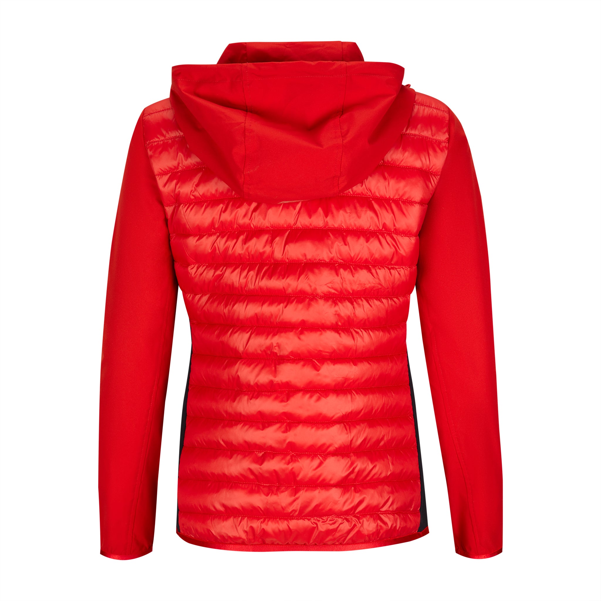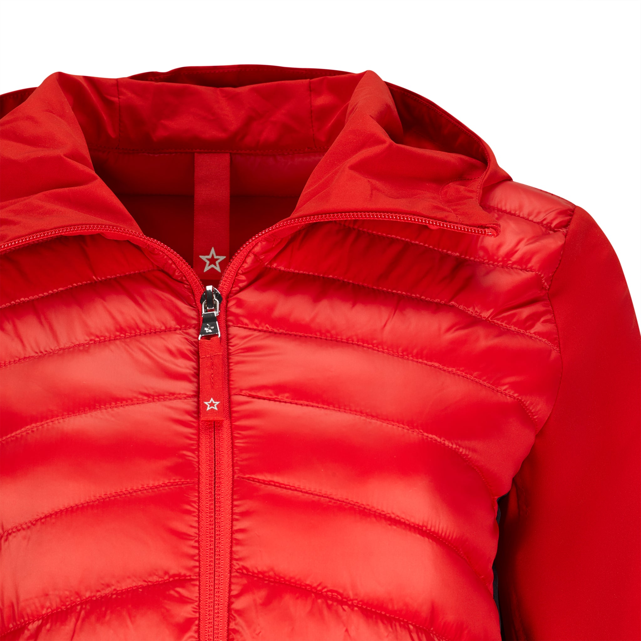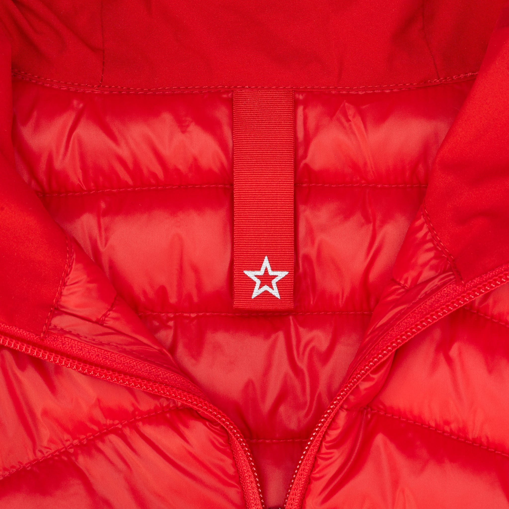 Quilted Jacket/Windbreaker Hybrid made especially to provide warmth and wind relief for any sport. Trendy quilting design. Shiny appearance. Attached hood. Two front pockets. (1) 100% POLYAMIDE (2) 100% POLYESTER