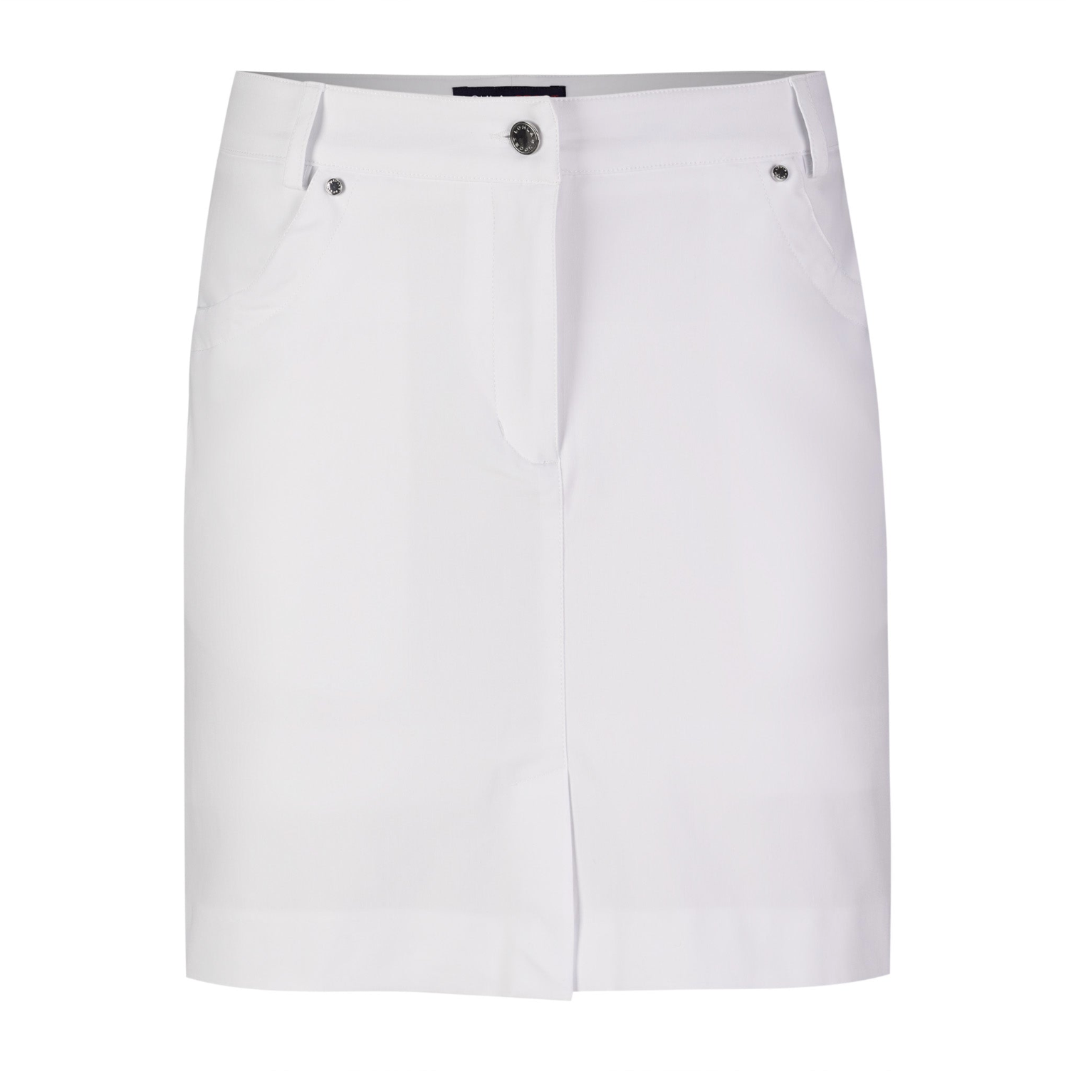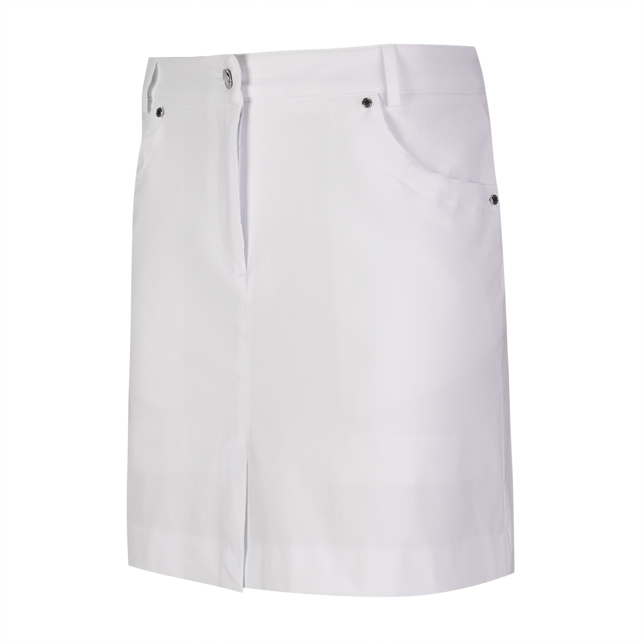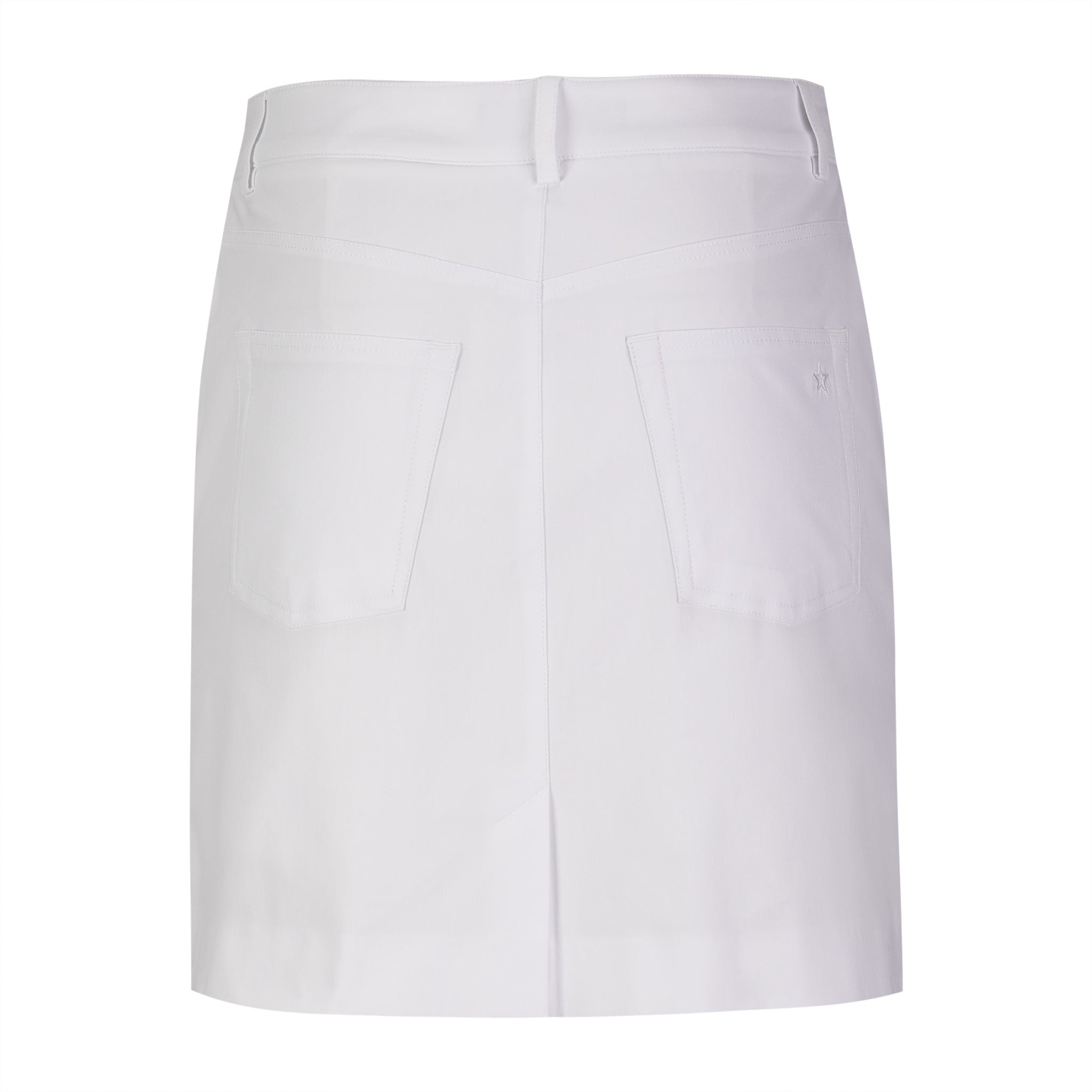 The perfect skort for sport or lifestyle. Button closure. Front and back kick pleat for optimal movement. 16" length (15" from bottom of waistband). French luxe stretch fabric.