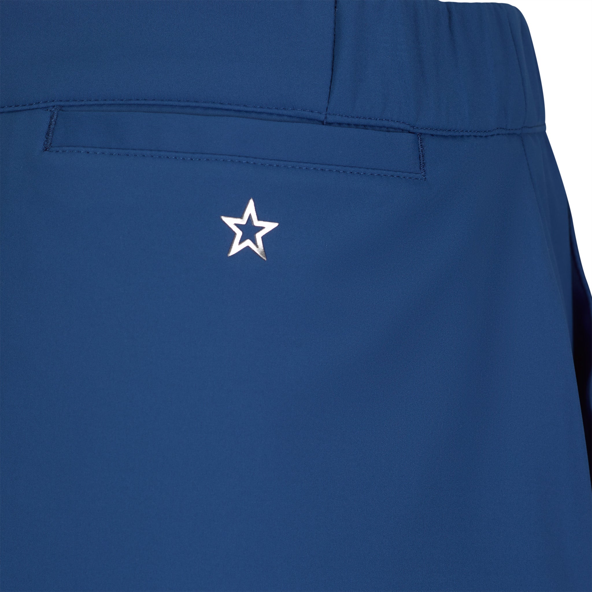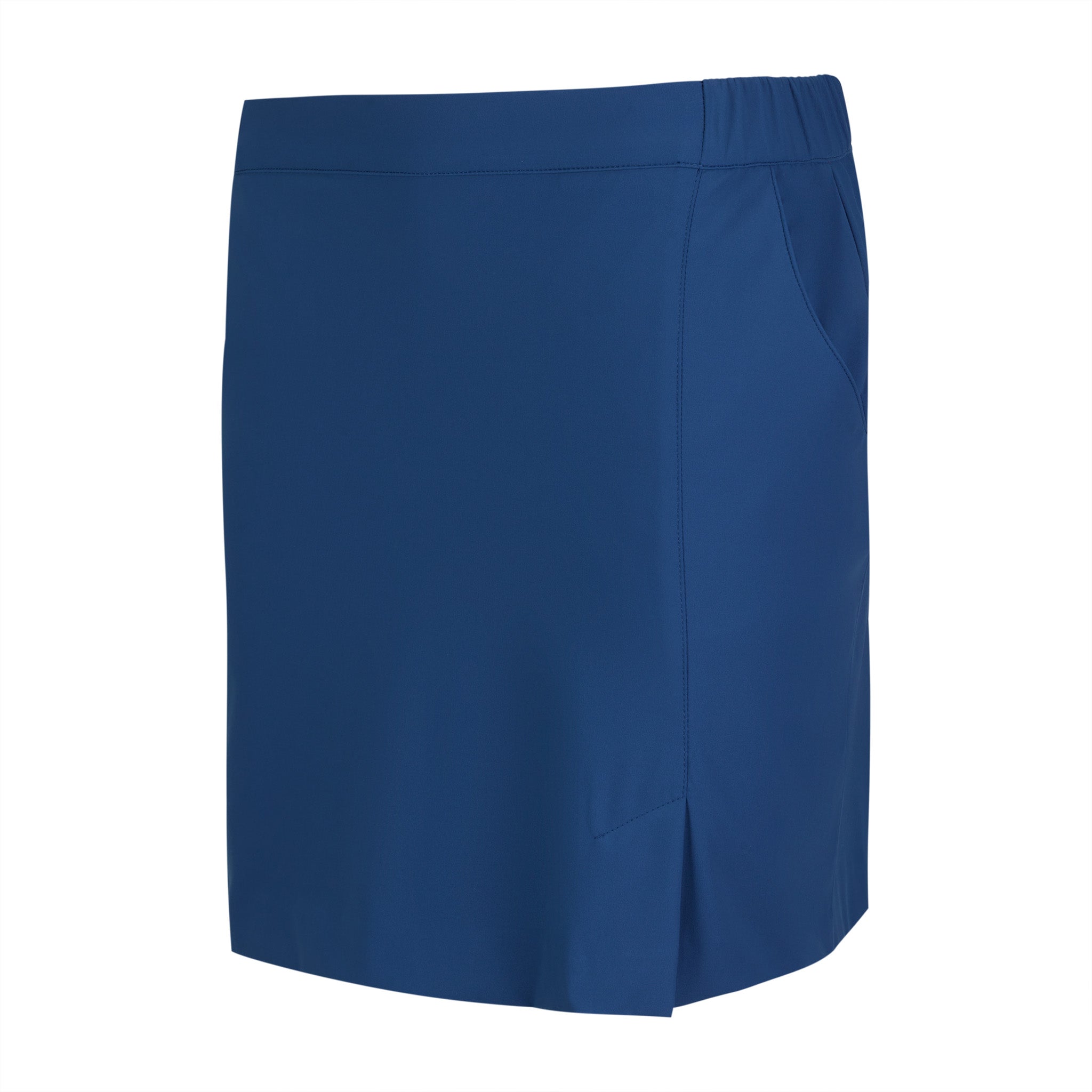 Solid pull on skort with stretchy elastic waist. Ample front pockets for many sport or lifestyle activities. One back inside pocket which can accommodate most cellular phones. 15" length.