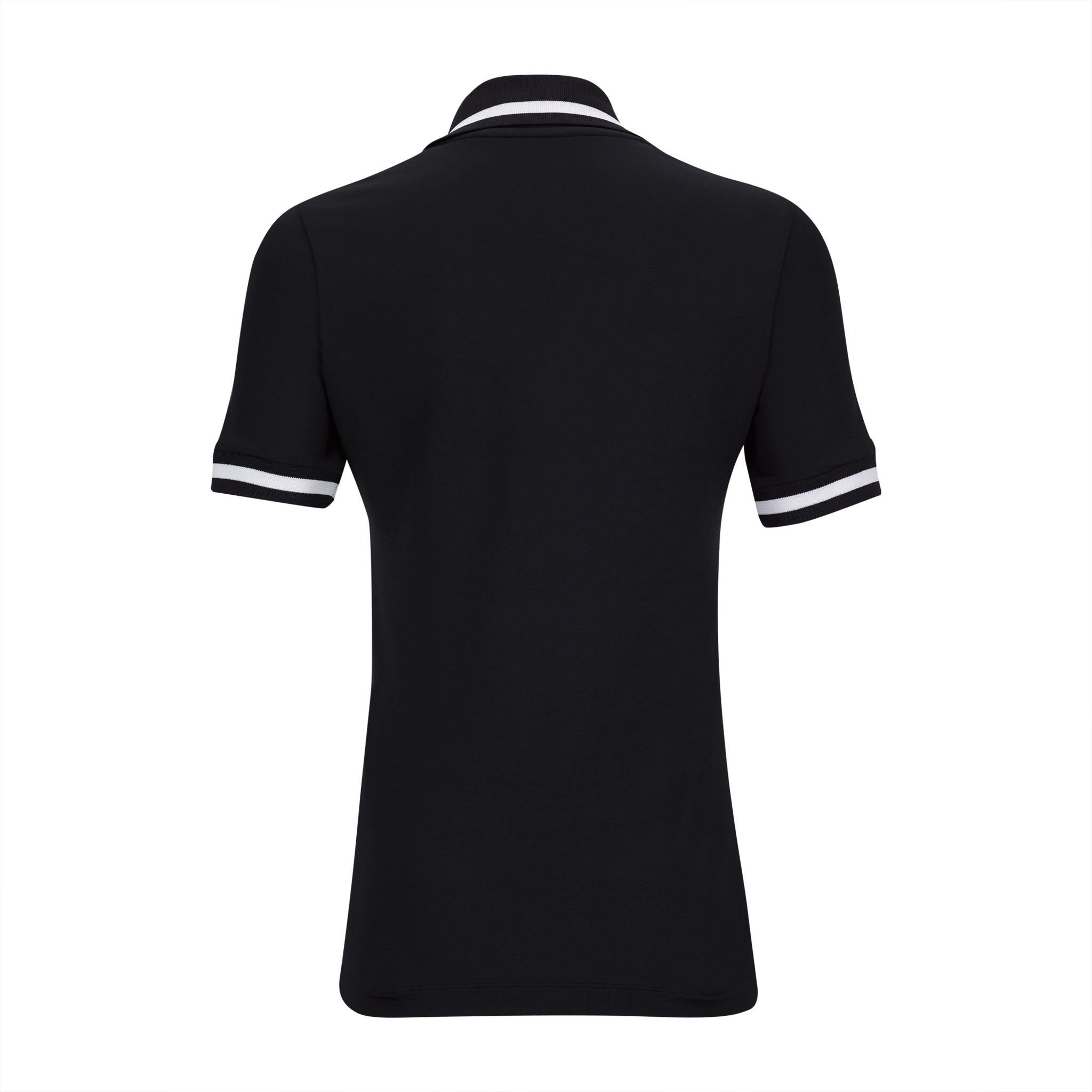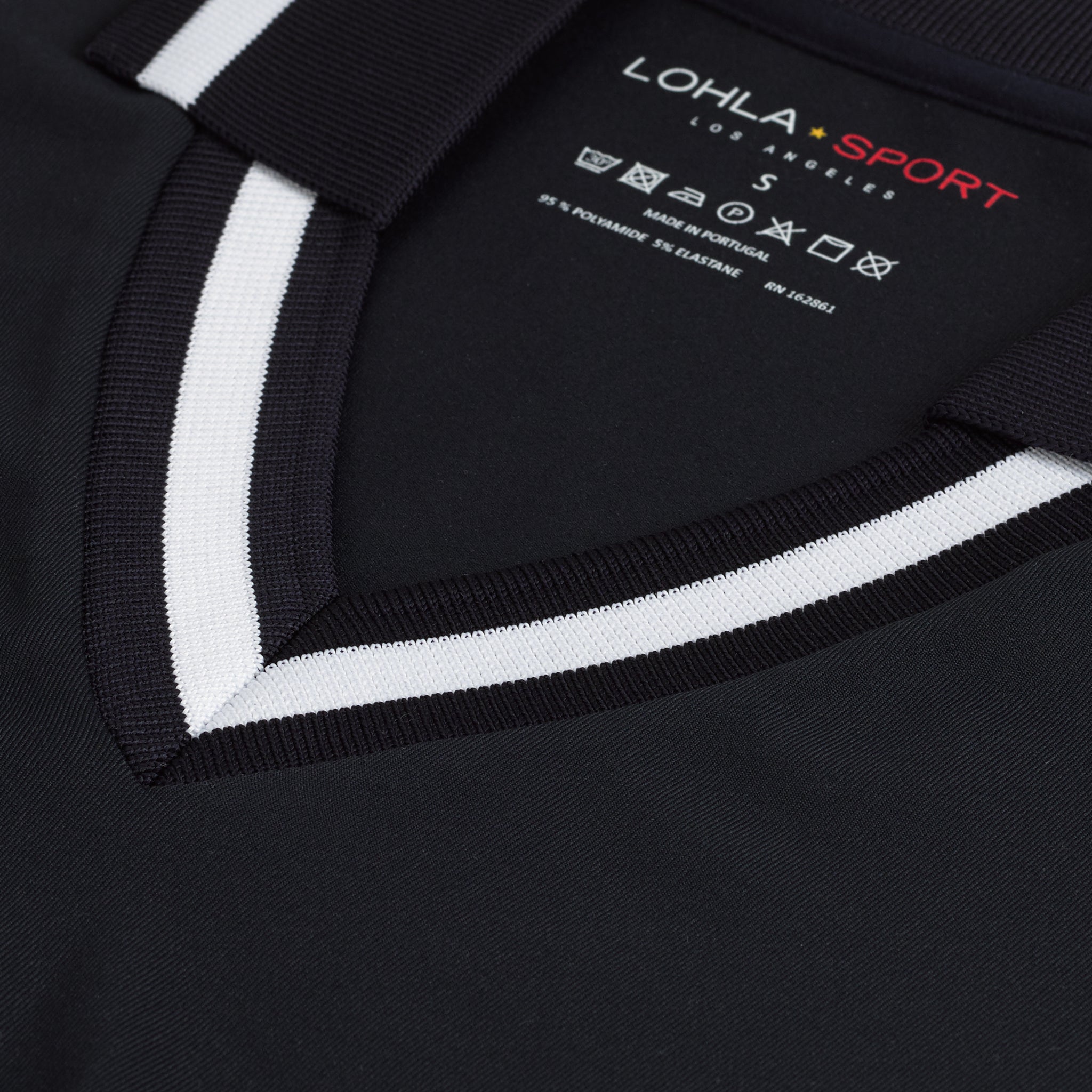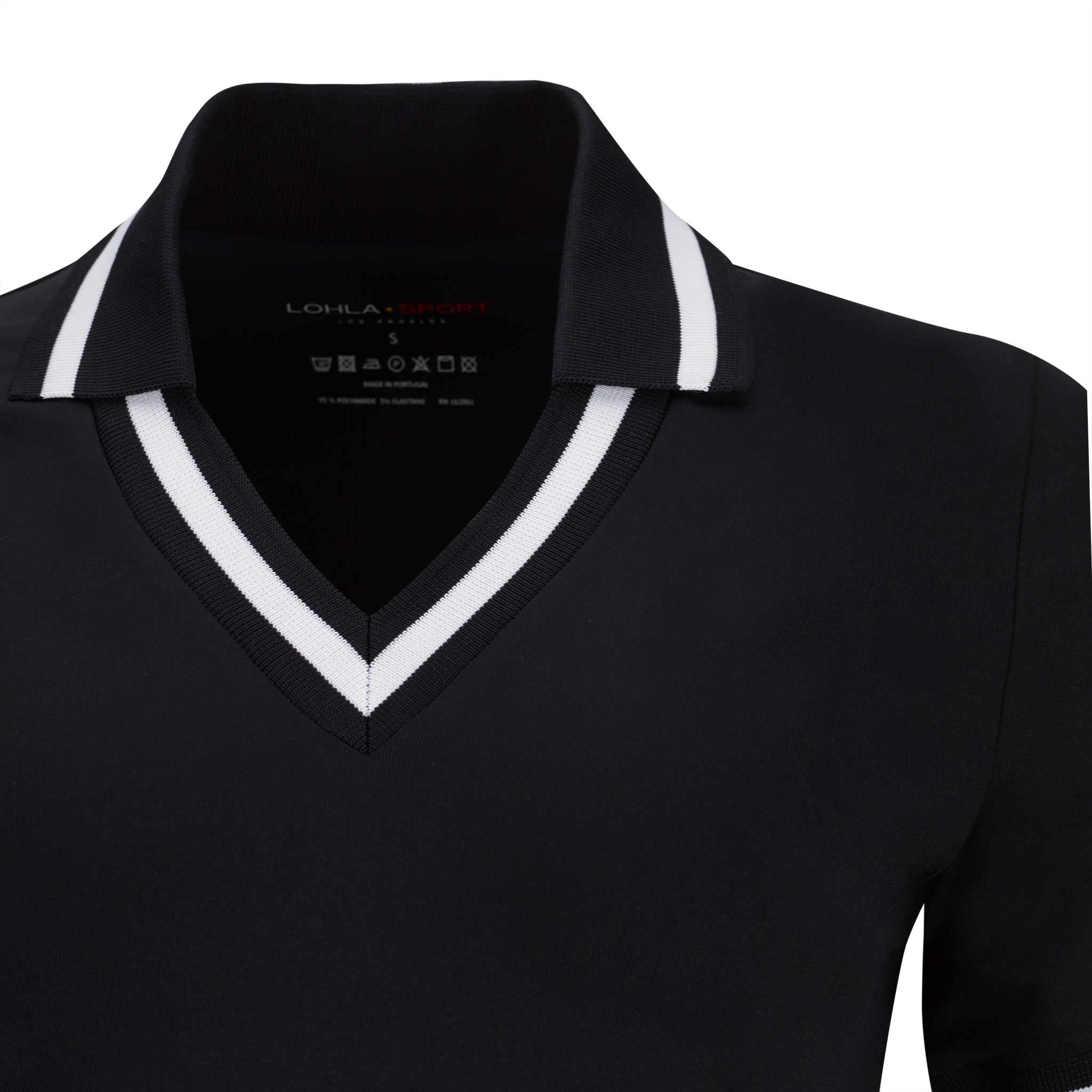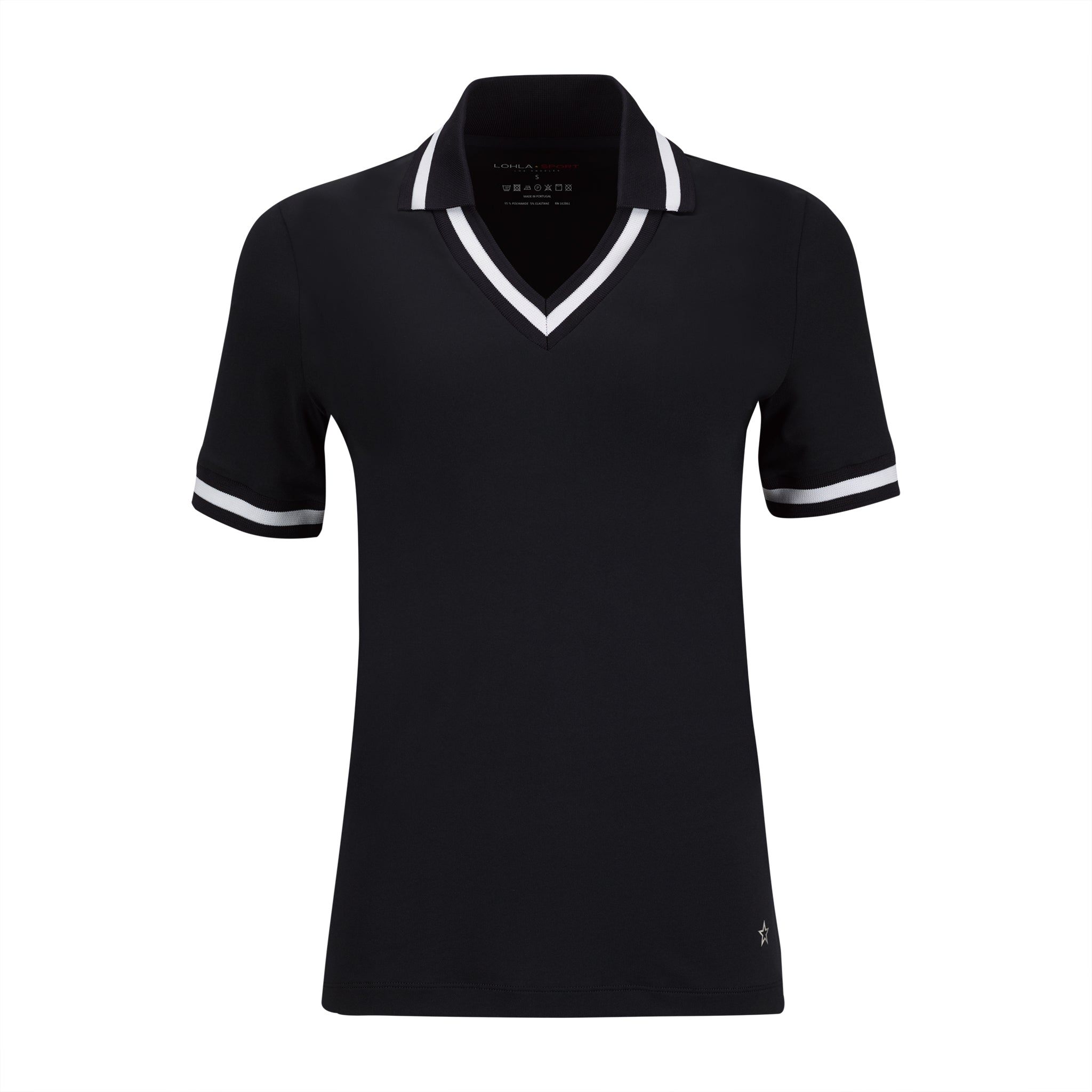 White dry luxe short sleeve top featuring preppy navy/white stripe V neck and cuffs. Unique added collar can be worn up or down. 95% PA, 5% EL.