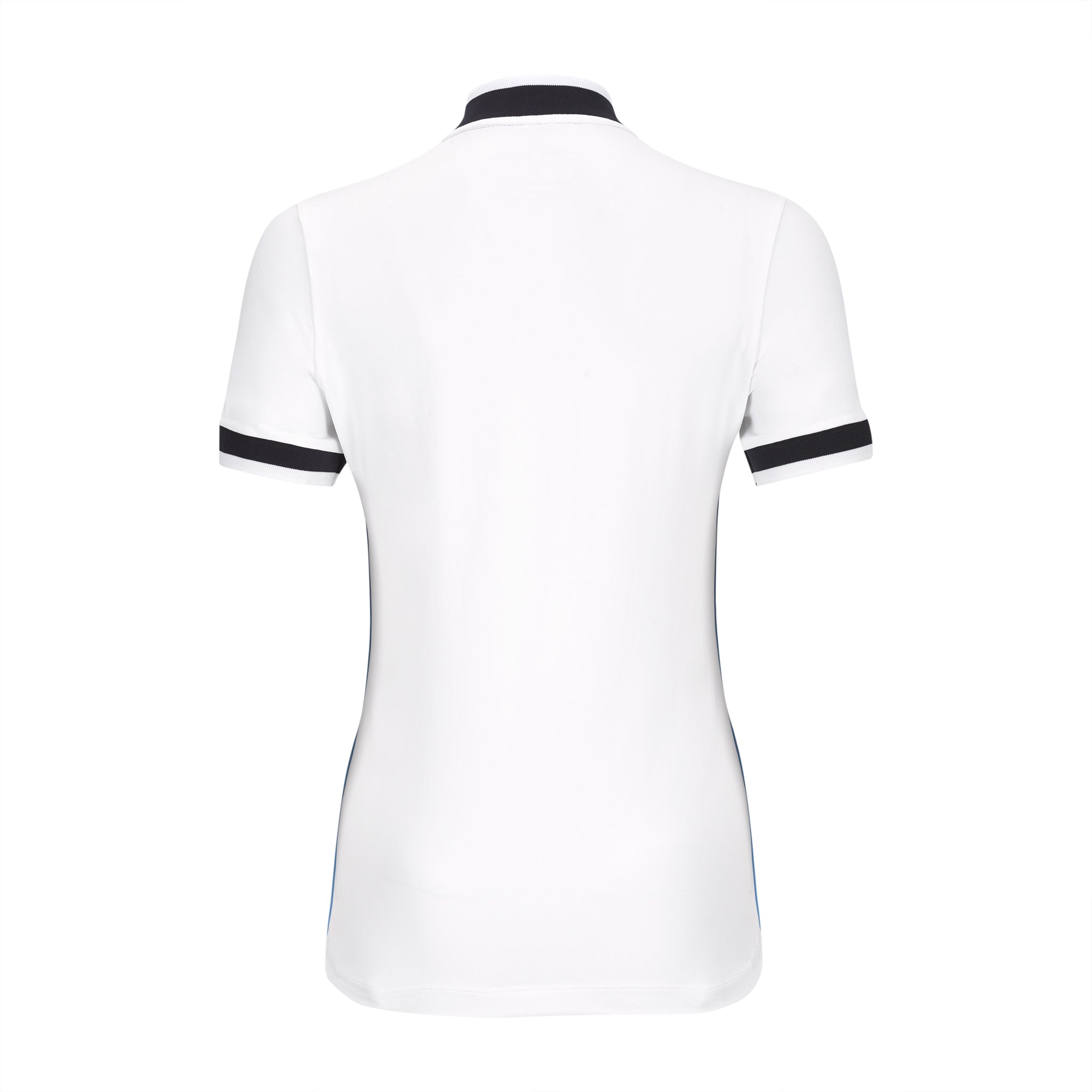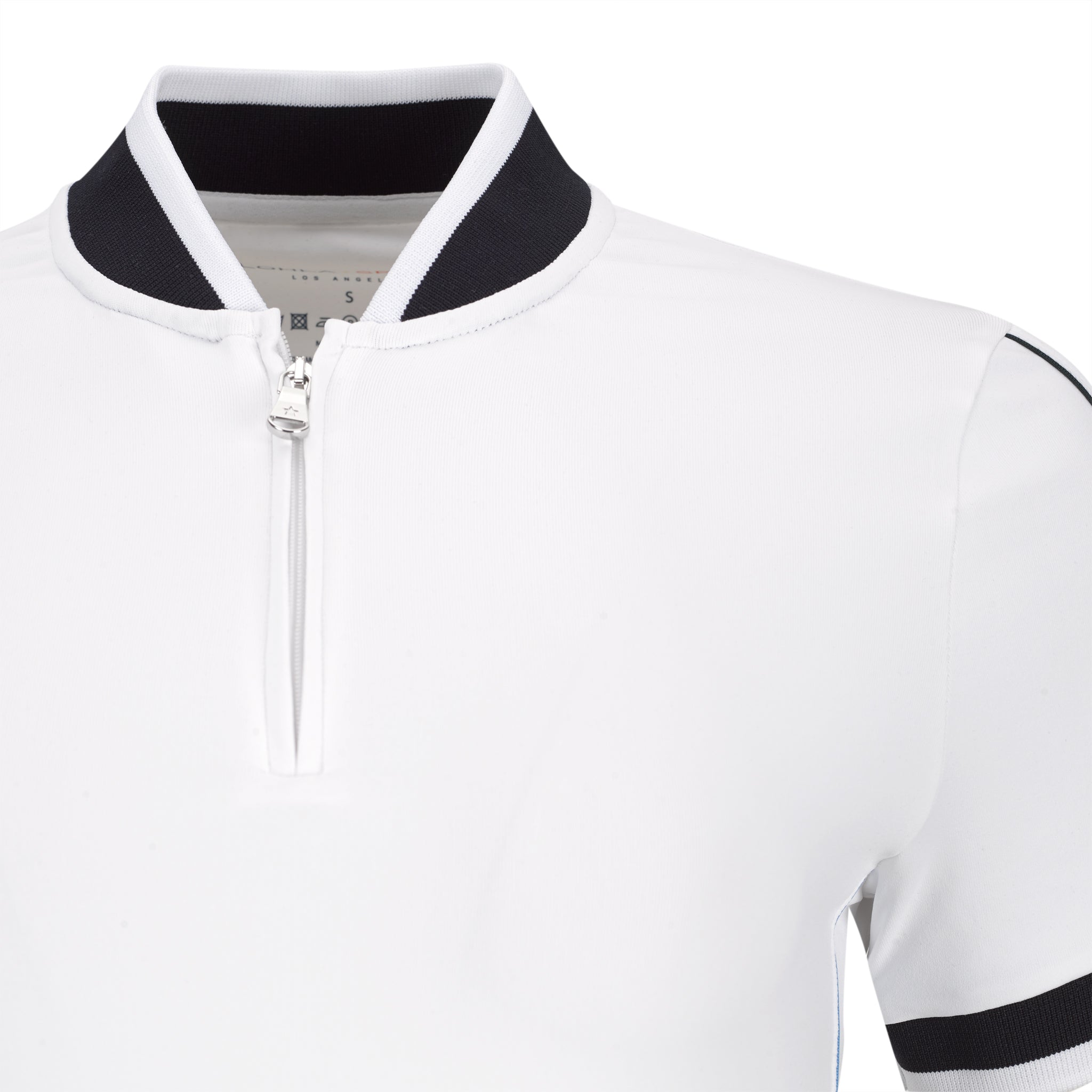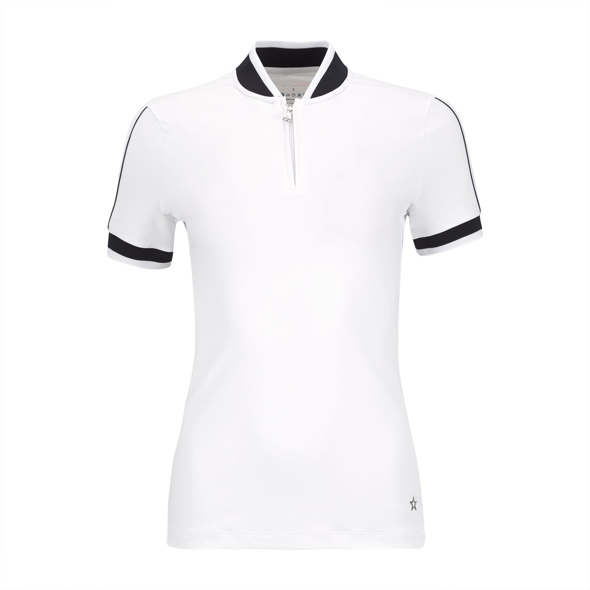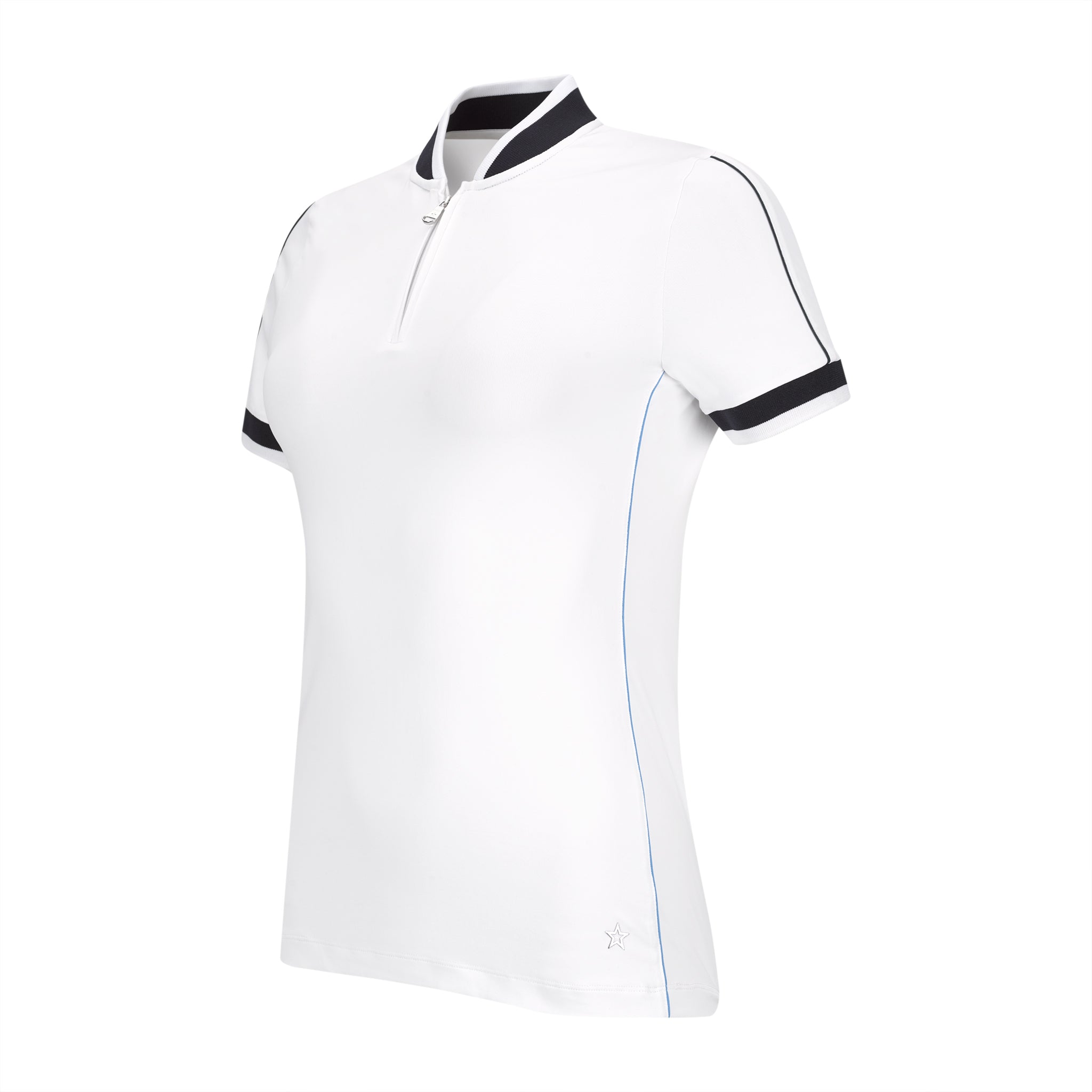Dry luxe short sleeve polo shirt with contrast piping in Iris and Pine for visual interest. Knit collar with navy band and banded sleeves. Zipper at the placket. 95% PA, 5% EL