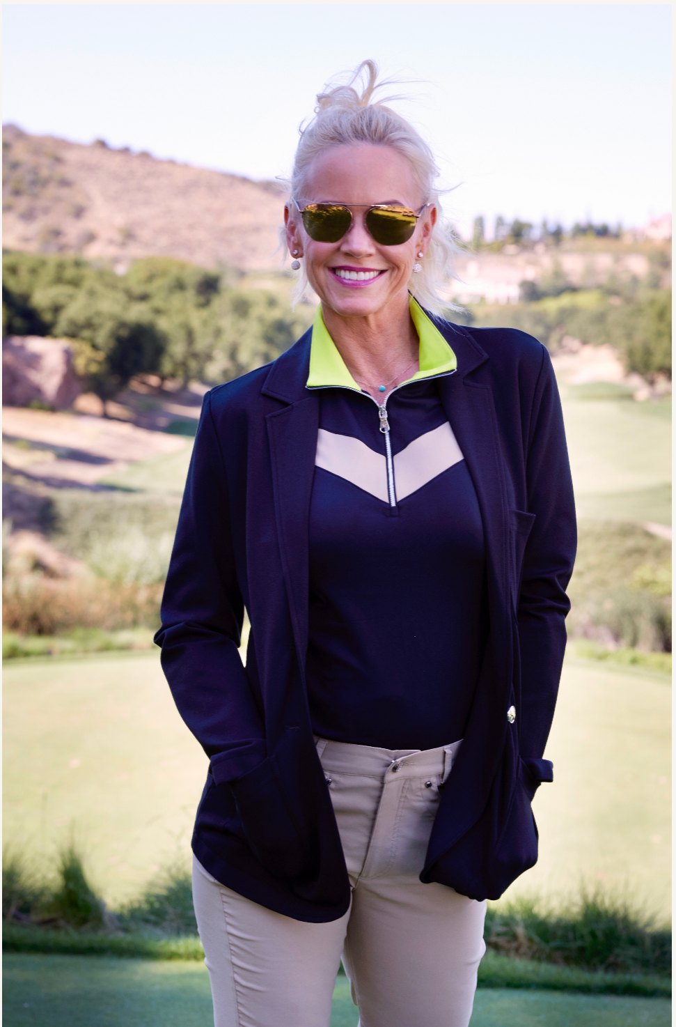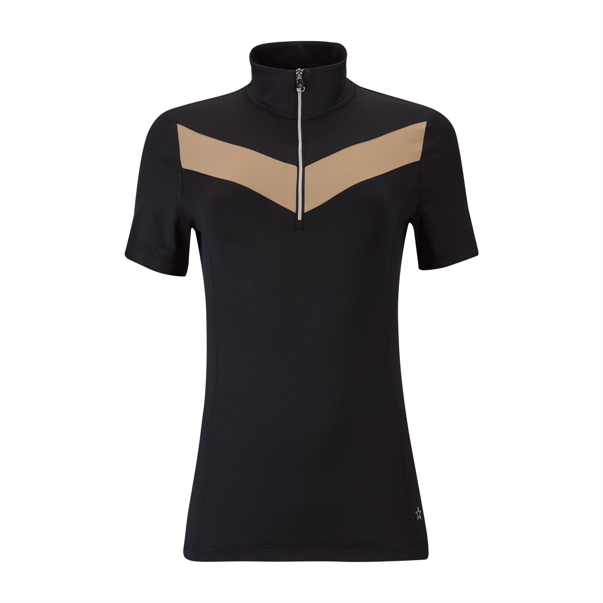Striking black stretch short sleeve top with khaki chevron placed at chest. 85% PA/15% EL.