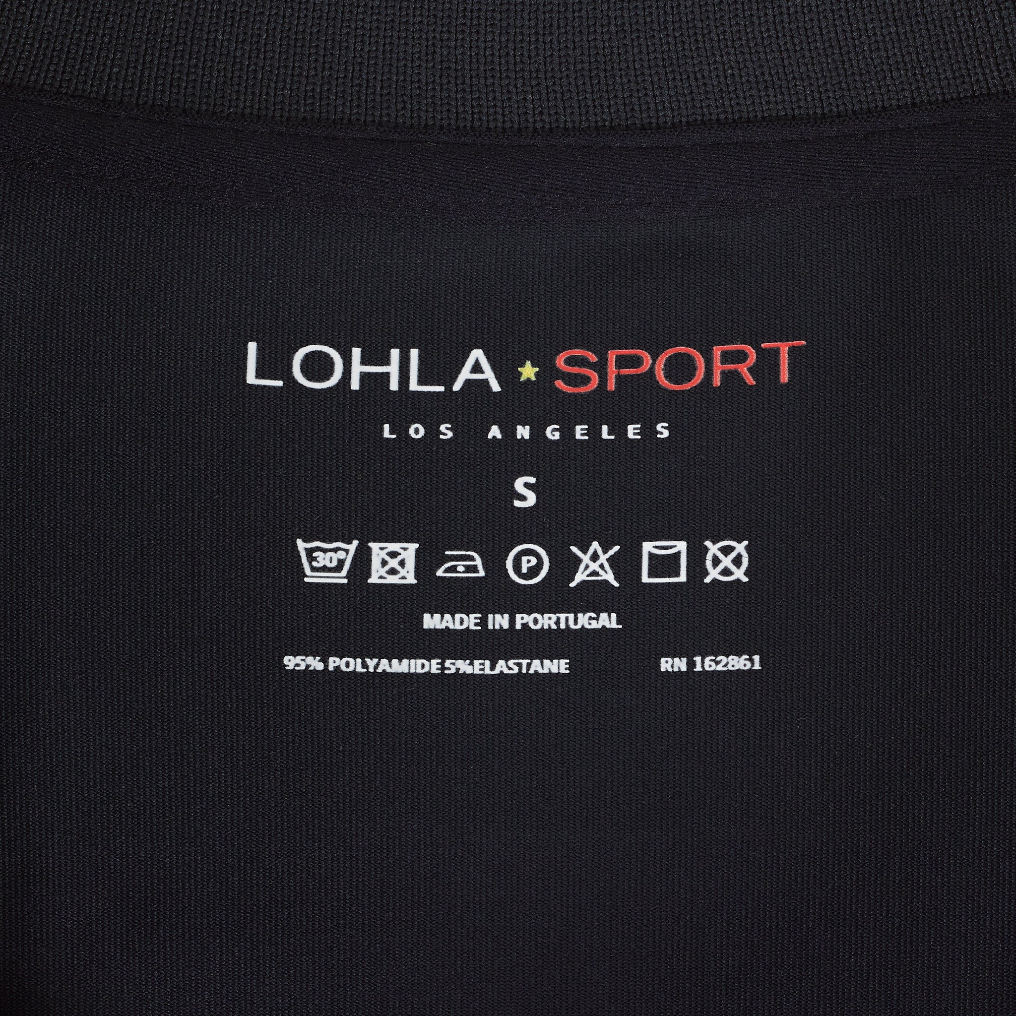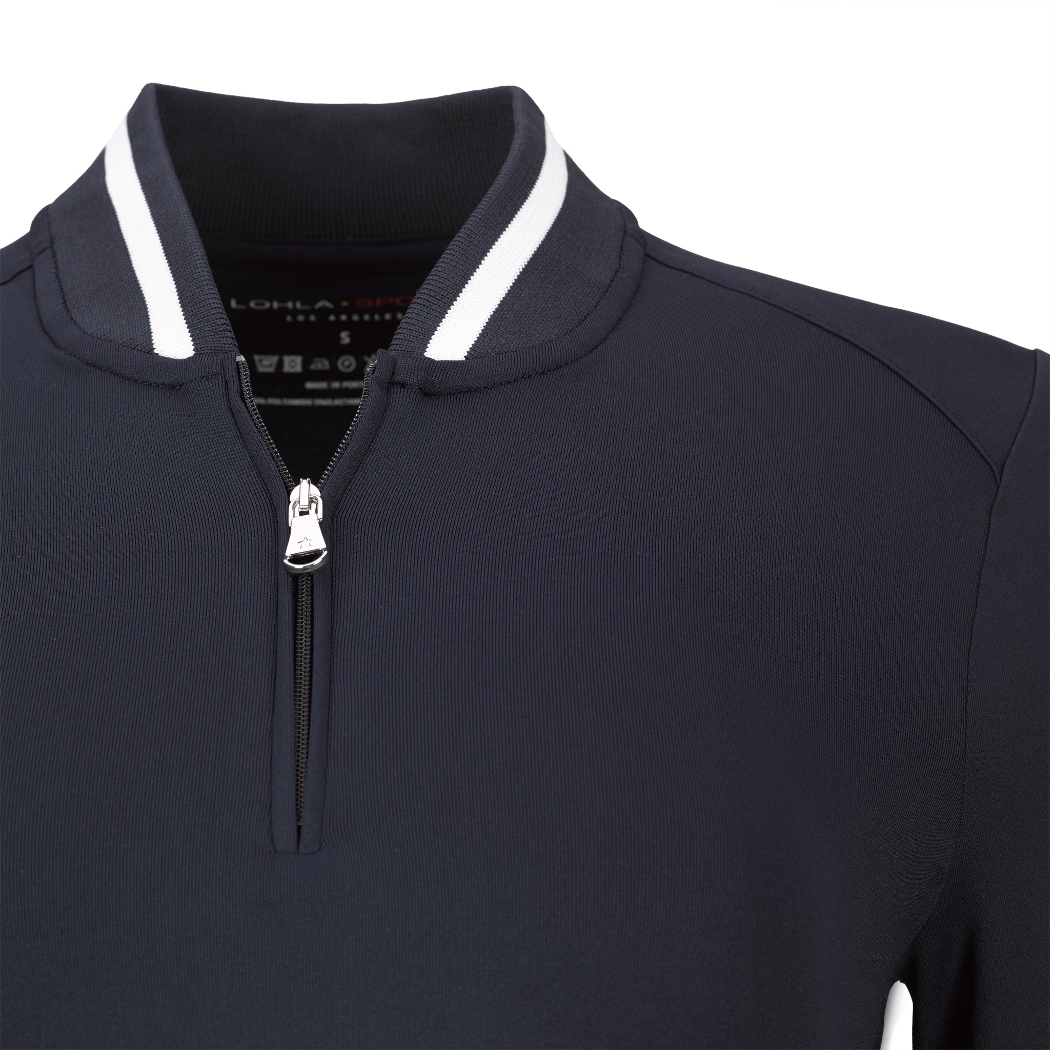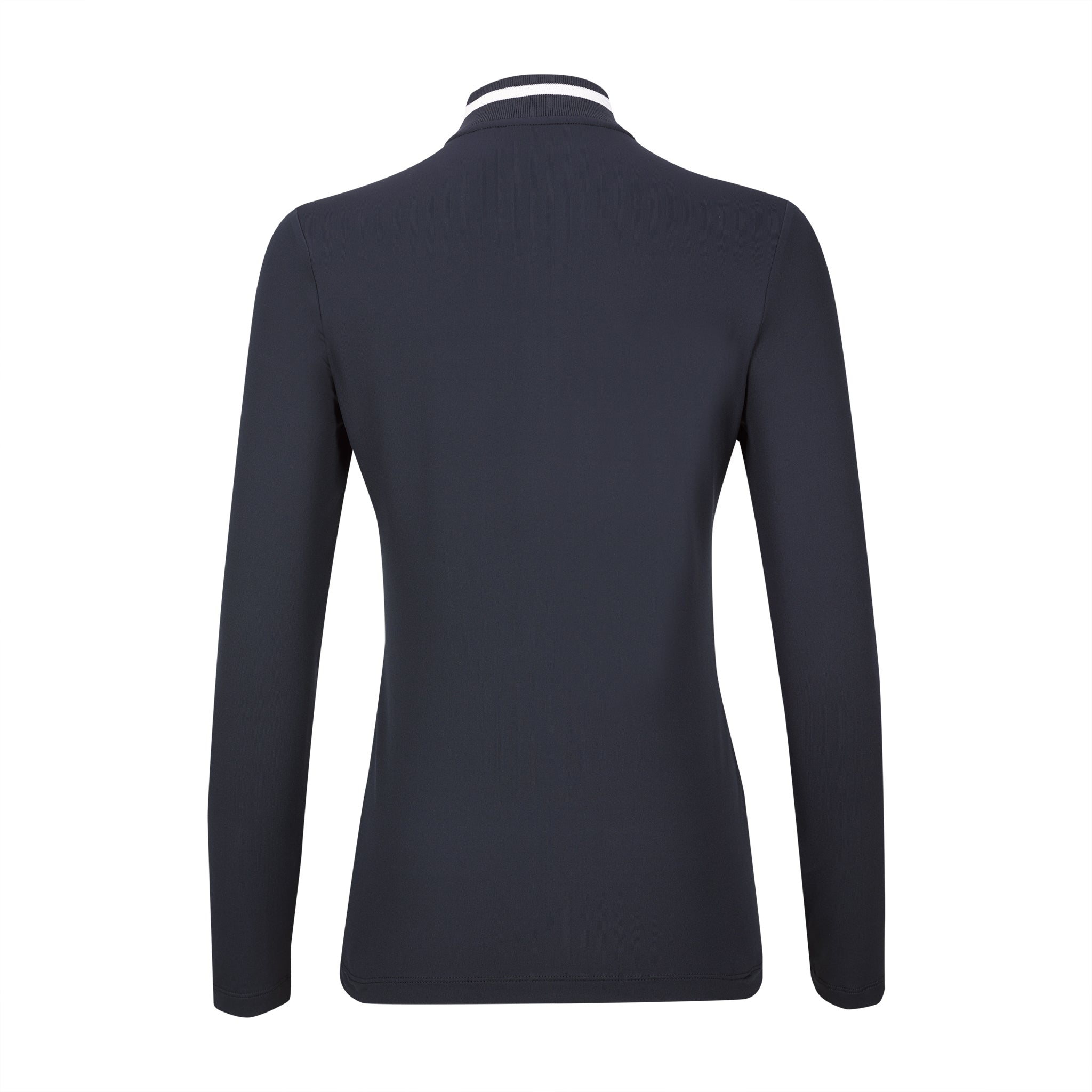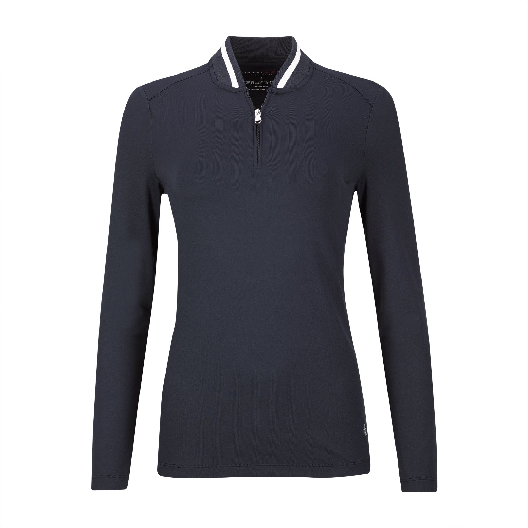Solid long sleeve dry comfort top (SPF 30) with knit ribbed "baseball/bomber" collar with contrast stripe. 95% PA/5% EL.