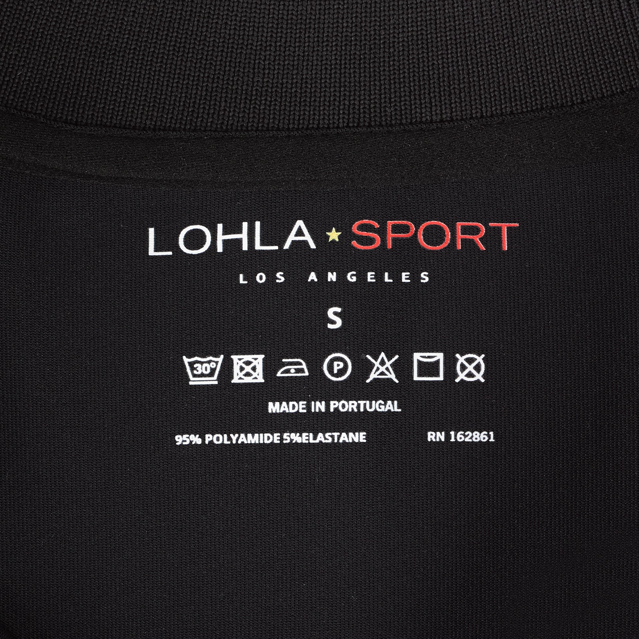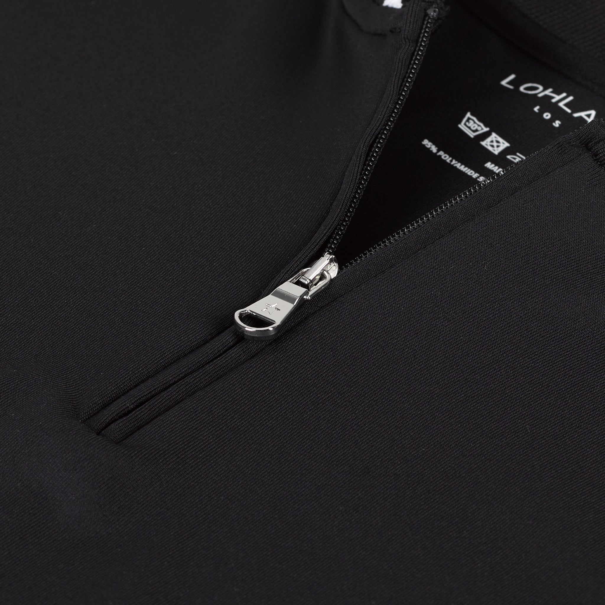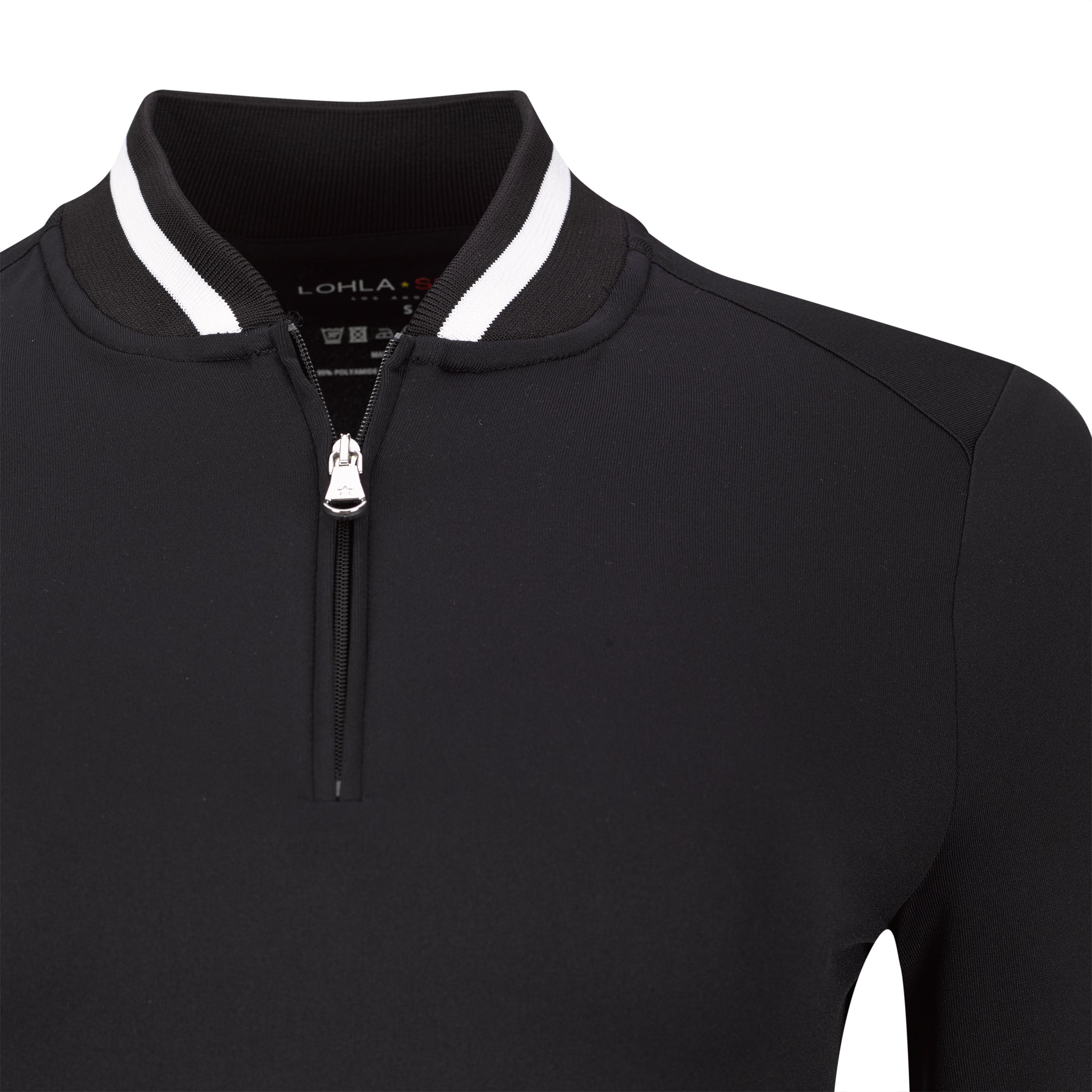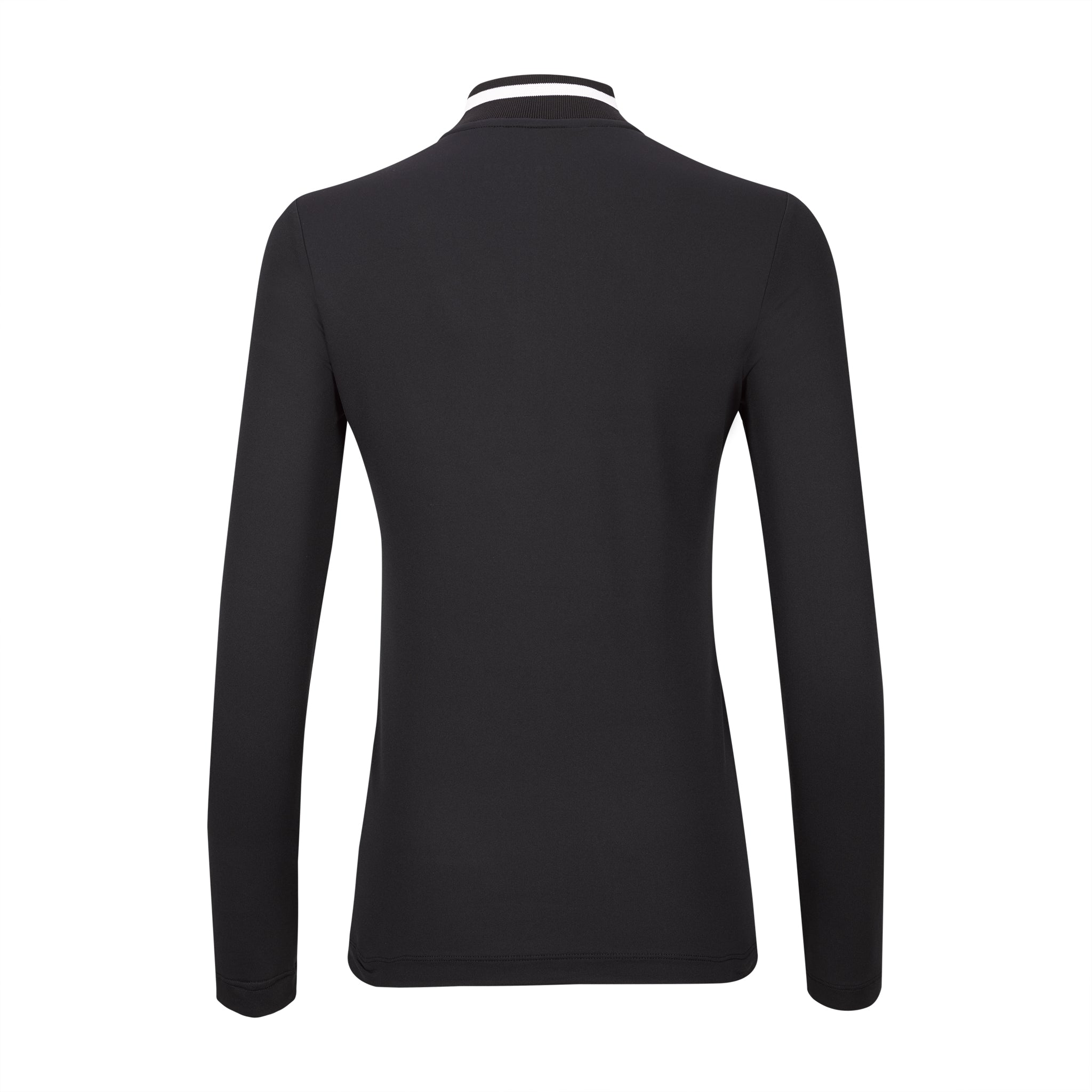 Solid long sleeve dry comfort top (SPF 30) with knit ribbed "baseball/bomber" collar with contrast stripe. 95% PA/5% EL.